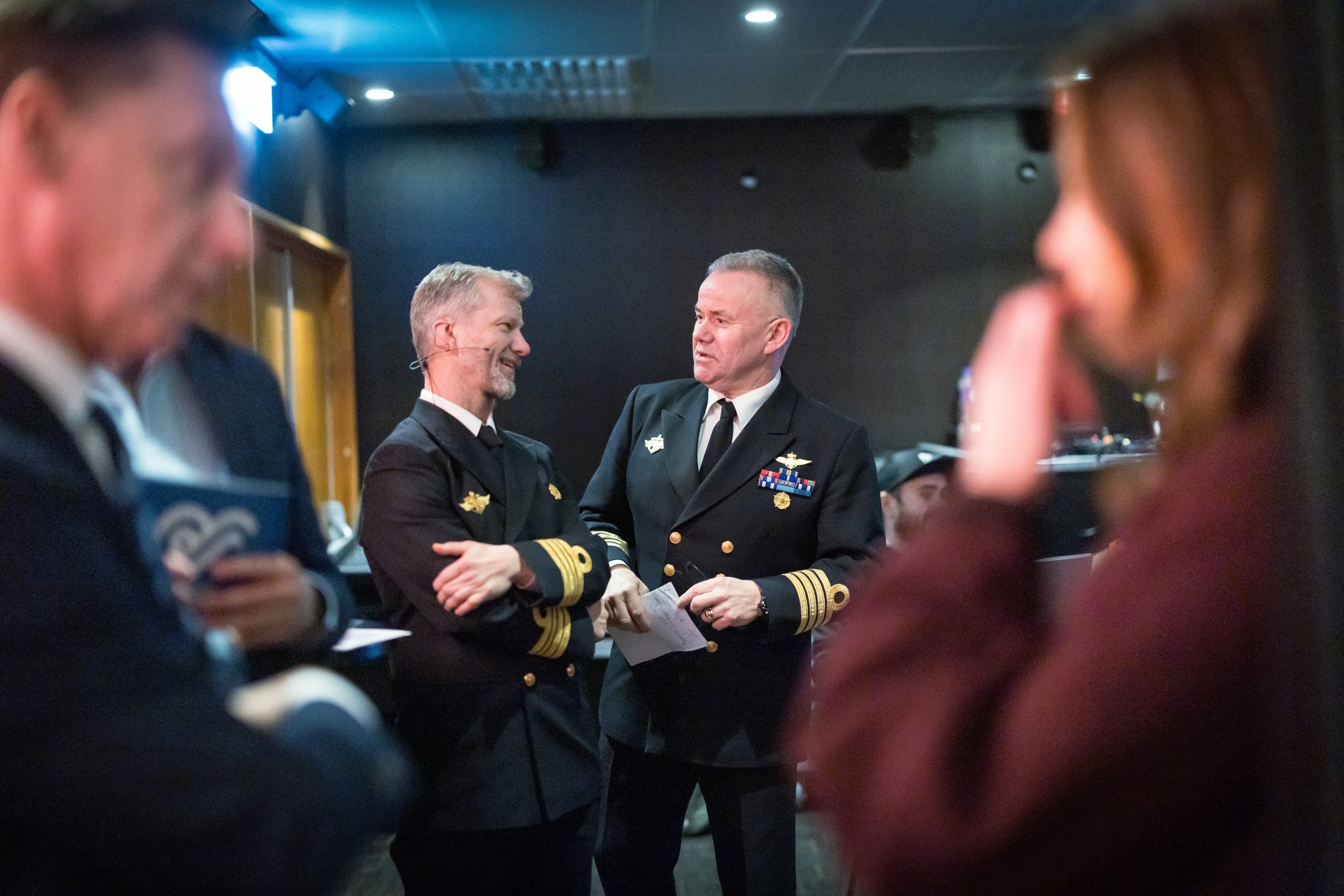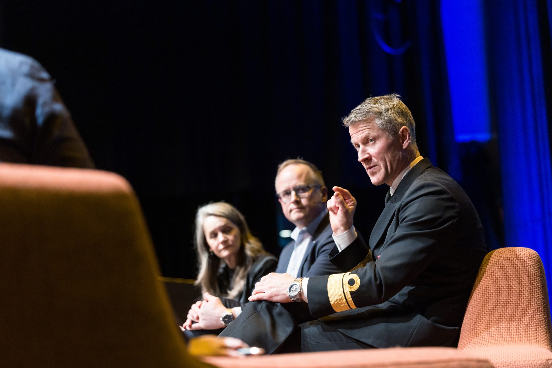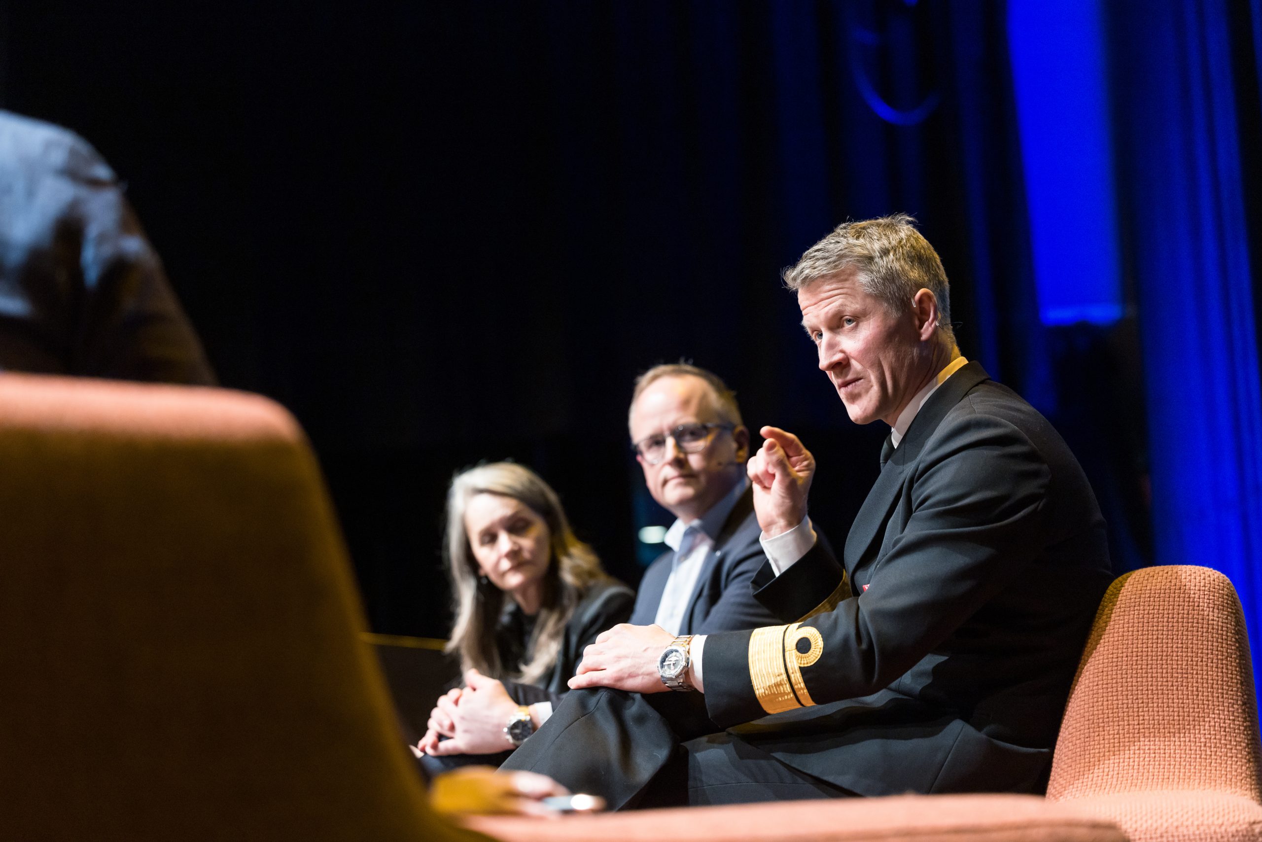 Sjef sjø, Oliver Berdal i samtale med Kjell Inge Bjerga (IFS) og Hanne Skartveit (VG) under Forsvarskonferansen i Bergen. Foto: Eivind Senneset.