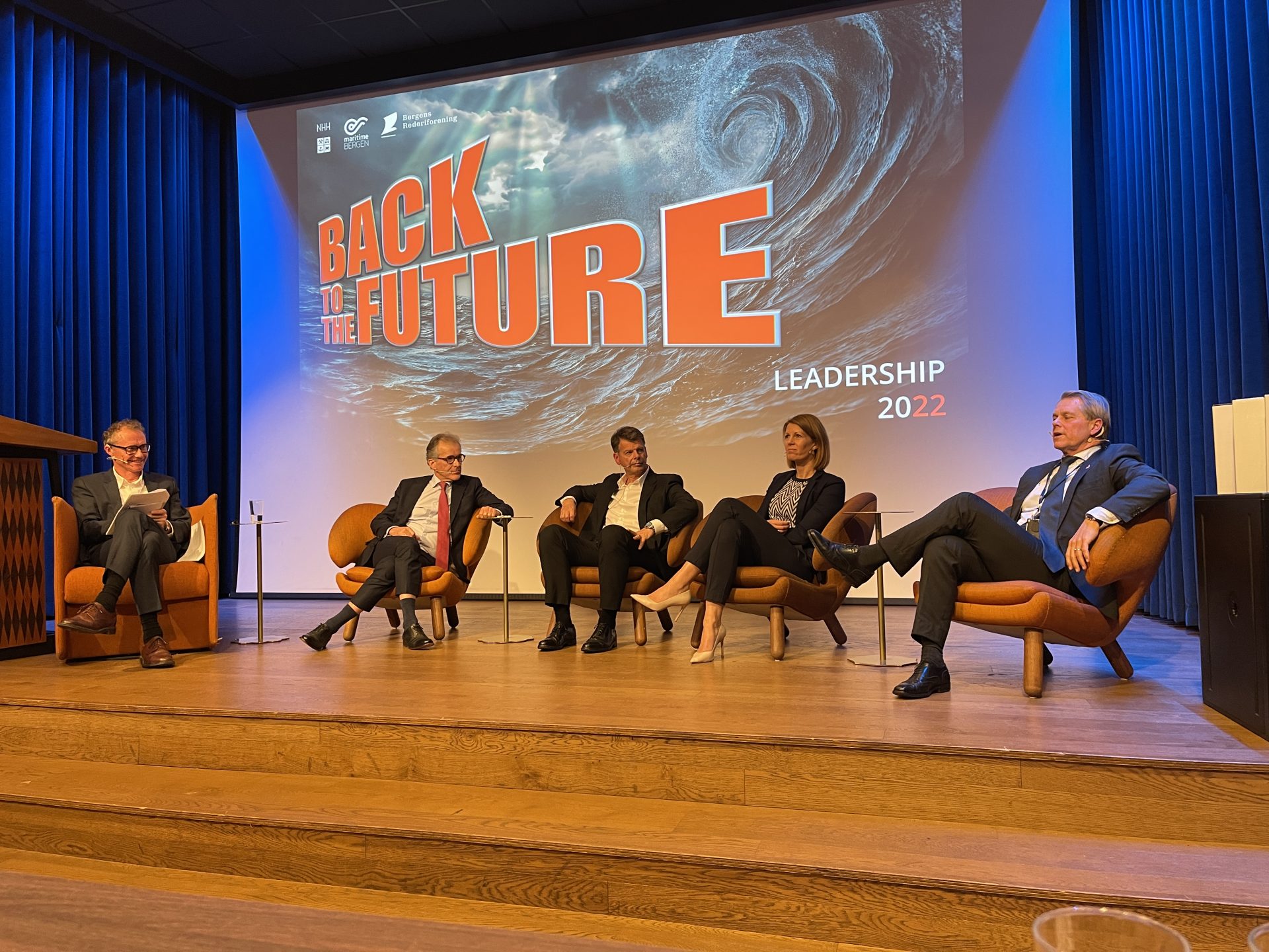 Konferansier, Julian Bray (t.v.) i panelsamtale med Paul Christian Rieber, Harald Fotland, Ragnhild Fresvik og Mons Aase under dagens konferanse. Foto: Krysta Alexa Singh / Maritime Bergen